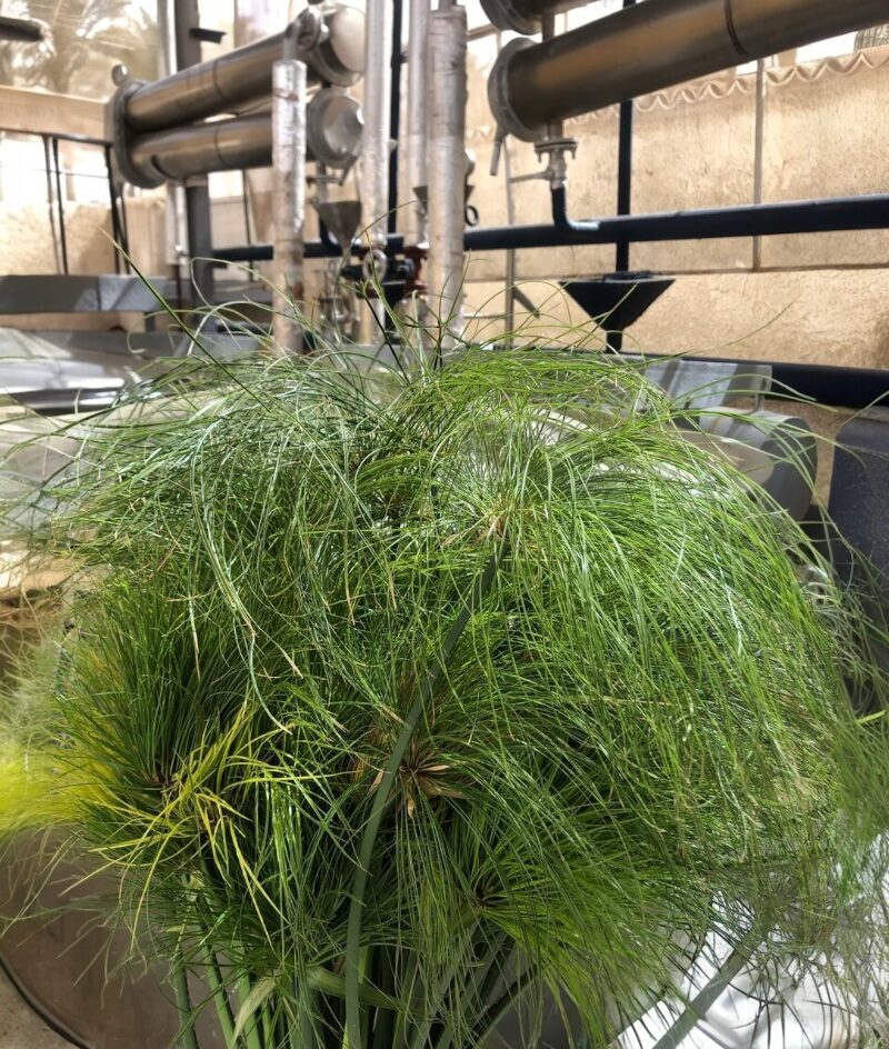 通常のパピルスではこれらの成分が時間が経ったものを使ったり、乾燥や熱のせいで失われてしまうようですが、この工房のように収穫したばかりの根茎を短時間で乾燥しすぐに蒸留することで、その揮発成分が保たれたままでグリーンで瑞々しい香りが生まれるみたいです。